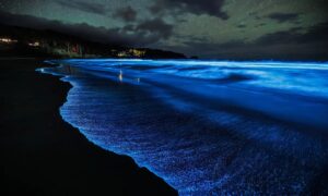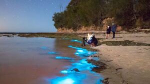Fenomena bioluminescence in marine organisms bisa terlihat secara spektakuler di pantai saat organisme bercahaya ketika gelombang atau arus laut mengganggu mereka.